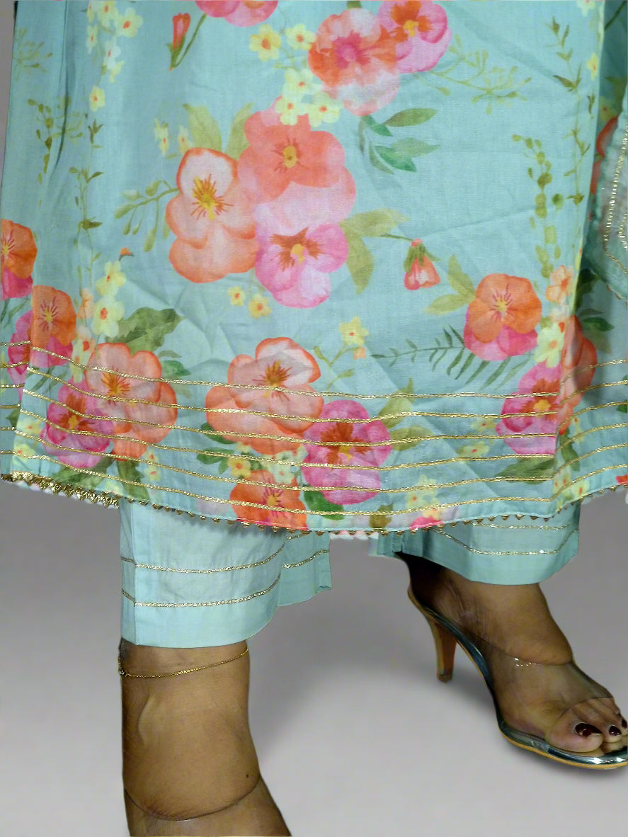 Our Light Blue Three-Piece Kurti Set is crafted from soft mul cotton with a mul lining for comfort. The kurti features a V-neckline with zari work, embroidery, and sequins, while the straight sleeves and hem have gota patti lace. Paired with matching pants and a chiffon dupatta, this set blends traditional craftsmanship with modern elegance, perfect for any occasion.